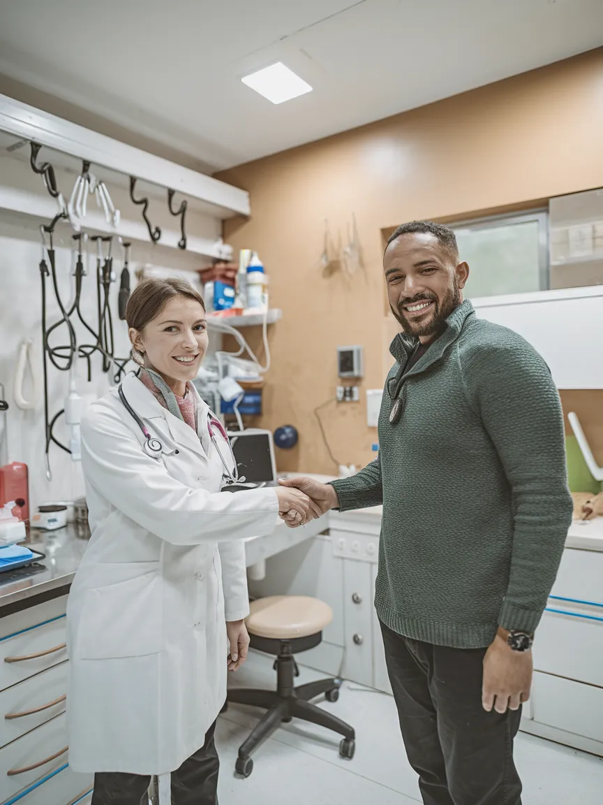 A dental practice owner shaking hands with a DentalBroker representative, symbolizing a successful practice sale agreement.